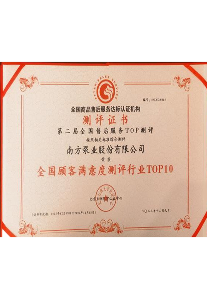 南方泵業(yè)多次獲得測(cè)評(píng)行業(yè)證書和售后服務(wù)體系認(rèn)證證書,包括認(rèn)證體系的七星級(jí)(卓越)、十二星級(jí)等最高等級(jí)的認(rèn)證。